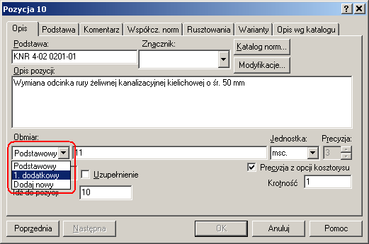 Rys.3. Lista dostępnych obmiarów w oknie edycji danych pozycji.