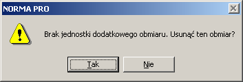 Następnie wybieramy hasło 1. dodatkowy. W polu wartości obmiaru pojawi się uprzednio nadana mu wartość, a w polu jednostki pojawi się symbol m. Musimy teraz wejść w pole jednostki i usunąć ją np. klawiszem Del. W tym momencie drugi obmiar zniknie całkowicie jeżeli twierdząco odpowiemy na pytanie w oknie: