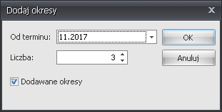 W przypadku najczęściej występujących rozliczeń miesięcznych, klikamy przycisk Dodaj miesiące i w wyświetlonym oknie wybieramy Od terminu: oraz wpisujemy liczbę miesięcy, które mają być dodane. Gdy miesiące mają zostać dodane jako okresy, opcja Dodawane okresy powinna być zaznaczona, a gdy jako podokresy – pozostawiamy pusty kwadracik.