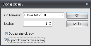 Gdy podokresami rozliczeniowymi w kwartale mają być miesiące, zaznaczamy opcję Z podokresami miesiącami. W polu Liczba: wpisujemy liczbę wstawianych kwartałów. Kwartały zostaną wstawione jako okresy przy zaznaczonej opcji Dodawane okresy, a jako podokresy – gdy pozostawimy pusty kwadracik.