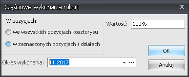 Przycisk Częściowe wykonanie robót umożliwia dodanie częściowego rozliczenia wykonanych robót dla zaznaczonych lub dla wszystkich pozycji.