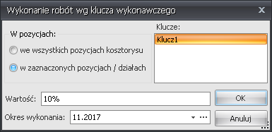 Wykonanie wg klucza wykonawczego powoduje dodanie rozliczenia wykonanych robót dla wybranych kluczy wykonawczych. Rozliczenie można wstawić dla zaznaczonych lub wszystkich pozycji w wybranym okresie rozrachunkowym.