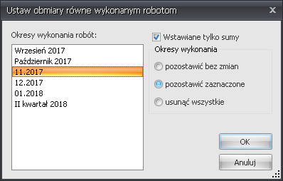 zaznaczmy okres wykonania robót, z którego brany jest obmiar (lista Okresy wykonania robót), zaznaczamy opcję Wstawiane tylko sumy, gdy chcemy, aby w kosztorysie w kolumnie Opis i wyliczenia w widoku Przedmiar zniknęło szczegółowe rozbicie, a pojawiła się całkowita suma obmiarów. Jeśli w grupie Okresy wykonania zaznaczymy opcję Usunąć wszystkie, okresy rozliczeniowe znikną z widoku wykonanych robót, a z widoku Przedmiar - zniknie szczegółowe rozpisanie obmiarów.