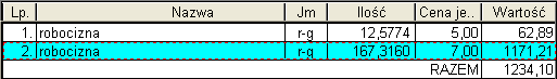 Na pierwszy rzut oka różnica między obu zestawieniami jest niedostrzegalna. Po uważniejszym przyjrzeniu się dostrzeżemy, że w zestawieniu na Rys.1. robocizna nr 2 ma nazwę rozszerzoną o znak ‘ (prim). W zestawieniu na Rys.2. nazwy są jednakowe, gdyż różnica tkwi w indeksie, który jest niewidoczny jeżeli nie dodamy do formularza rubryki „Indeks ETO”.