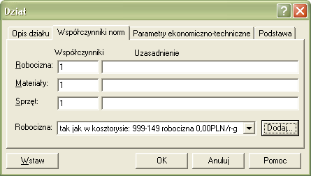 Przedstawiłem tu metodę określania różnych stawek robocizny dla różnych robót. Często jednak zdarza się, że stawka robocizny jest przywiązana do konkretnego działu, bo na przykład inną stawkę damy na roboty instalacyjne lub elektryczne, a inną na roboty murowe czy ziemne. Aby określić stawkę dla działu musimy w oknie Dział wybrać zakładkę Współczynniki norm i w wierszu Robocizna nacisnąć przycisk Dodaj.