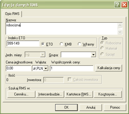 Możemy teraz określić stawkę dla definiowanej robocizny. Gdy wywołamy to okno dla następnego działu, to będziemy mogli określić inną lub taką samą stawkę. Gdy zechcemy określić inną, to musimy zmienić nazwę lub indeks zgodnie z opisanymi wyżej zasadami.
