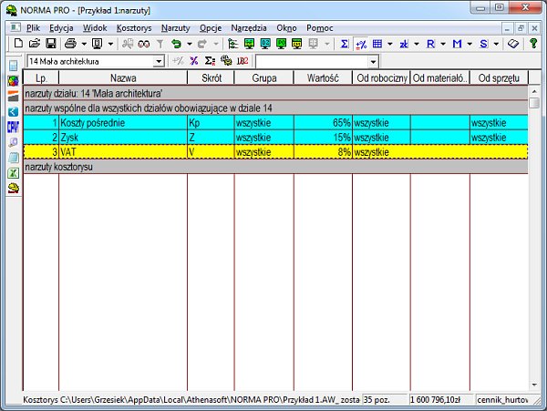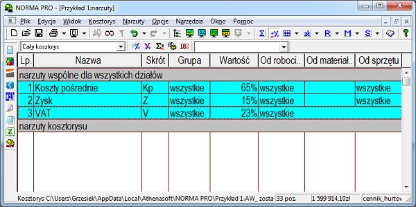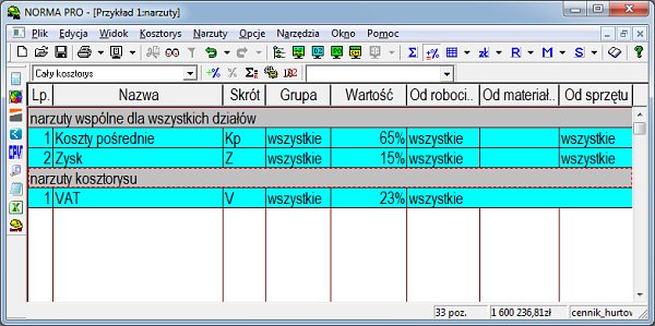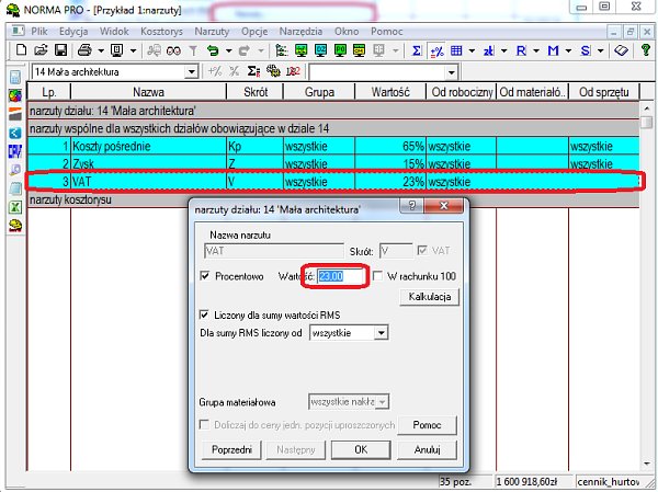 Problem VAT-u bierze się ze sposobu definicji narzutów w programie Norma PRO. Szablon narzutów został zdefiniowany właściwie dla założenia, że będziemy mieli jedną stawkę podatku w kosztorysie.