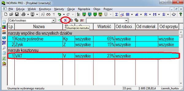 Jeśli w naszym dokumencie ma pojawić się np. stawka 23% i 8%, należy usunąć VAT z tabeli „narzuty kosztorysu” i dodać na nowo w tabeli „narzuty wspólne dla wszystkich działów”. W celu usunięcia narzutu w oknie tabeli podświetlamy wiersz VAT, a na pasku narzędziowym klikamy ikonę „Usuń narzut”.