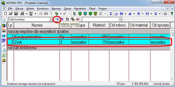 Gdy chcemy ponownie dodać VAT (właściwie dla omawianego przypadku) w oknie tabeli podświetlamy wiersz „Zysk” i na pasku narzędziowym klikamy ikonę „Dodanie narzutu”.