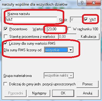 Wszyscy wiemy, że podatek VAT nie jest narzutem, ale ponieważ jest liczony procentowo został on umieszczony, dla wygody użytkowników, w oknie „Tabeli narzutów”.
