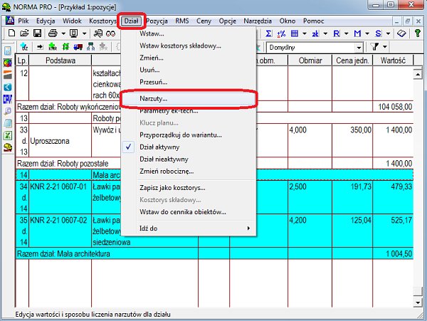 Teraz wystarczy po powrocie na widok główny kosztorysu (przycisk F5, lub menu Widok -> Kosztorys) zaznaczyć odpowiednią pozycję lub dział kosztorysu, dla których stawka VAT ma być zdefiniowana indywidualnie. W moim przypadku zaznaczam dział i z menu „Dział” wybieram polecenie „Narzuty”.