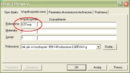 określaniu współczynników norm dla kosztorysu, działów i pozycji,