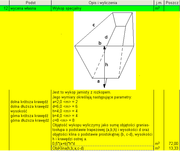 Otóż do biblioteki wzorów i funkcji programu Norma PRO można wstawiać po prostu fragmenty pozycji przedmiarowych zawierające dowolne wiersze i obiekty. Poniżej przedstawiam pozycję przedmiaru robót, do której wstawiłem rysunek poglądowy wykopu oraz komentarze wyjaśniające znaczenie poszczególnych parametrów.