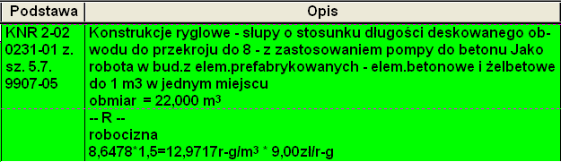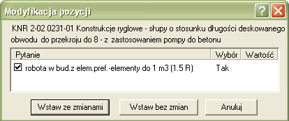 Do kosztorysu należało wprowadzić pozycję na wykonanie konstrukcji ryglowych – słupów o stosunku deskowanego obwodu do przekroju do 8. Prawidłowo została wybrana pozycja KNR nr 2-02 0231-01. W momencie wprowadzania pozycji do kosztorysu pojawiło się okno modyfikacji:
