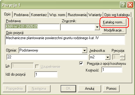 Rys.1. Okno definicji danych pozycji z zaznaczonym przyciskiem przywracania danych z katalogu norm