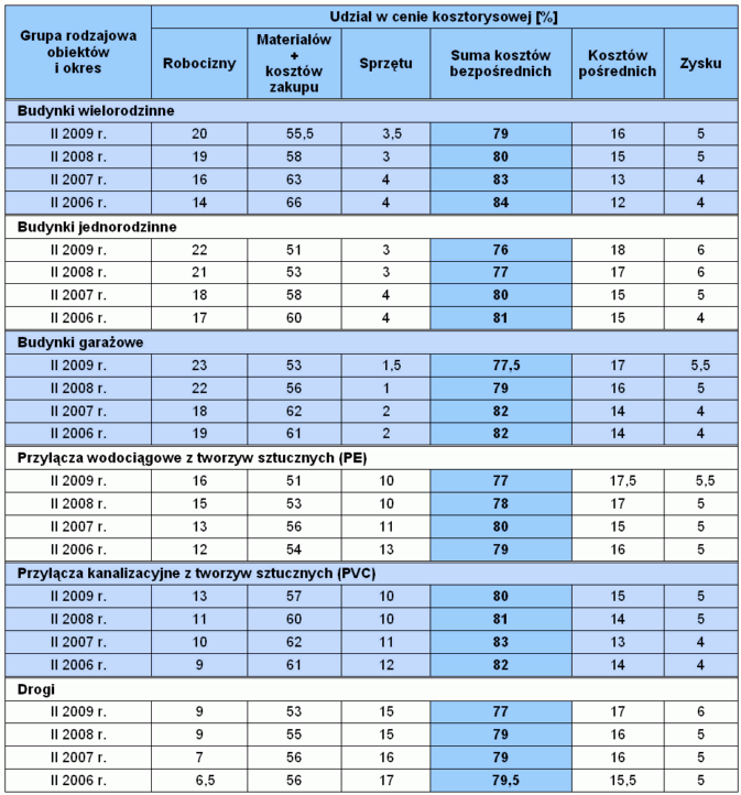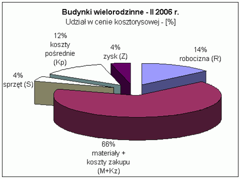 Zwiększył się również w cenie procentowy udział kosztów pośrednich i zysku. Ten fakt podyktowany został nie tylko wzrostem samych wskaźników ( w II kw. 2006 r. najczęściej stosowano narzut kosztów pośrednich na poziomie Kp = 66%, w II kw.2009 r. Kp = 70%, natomiast narzut zysku analogicznie Z = 12% i 13%) ale również wzrostem podstawy do ich naliczania, w której uwzględnione są również koszty robocizny.