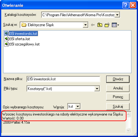 Rys.4. Widok krótkiego opisu podczas wyboru kosztorysu