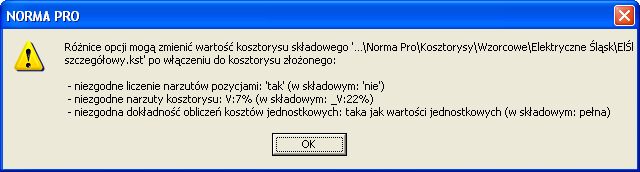 Powyższy komunikat pokazuje jakimi ustawieniami różnią się kosztorys obecny w pamięci i wstawiany właśnie kosztorys składowy. Jednocześnie mówi on nam, że te opcje pozostaną ustawione tak jak w kosztorysie, który już jest w pamięci.