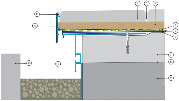 rys. 7 - Okap tarasu naziemnego z drenażowym odprowadzeniem wody i warstwą użytkową z płyt dekoracyjnych