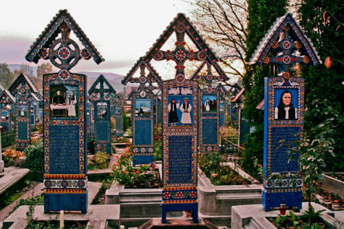 O wyjątkowości cmentarza w skali Europy stanowią unikalne kolorowe, drewniane nagrobki, na których wyrzeźbione są scenki z życia pochowanych tam mieszkańców wioski, często opatrzone dowcipnymi wierszykami mówiącymi o zmarłych lub przyczynach, z powodu których rozstali się z życiem.