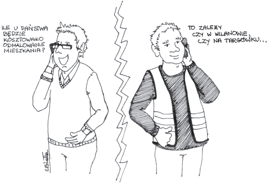 A zupełnie na koniec przyjrzyjmy się jeszcze jednej kategorii inwestorów. Powyżej mieliśmy do czynienia z większymi pieniędzmi, czy to publicznymi, czy prywatnymi, a co z tymi z przysłowiowego „M-2, 3, 4”? Mieszkanie też w końcu trzeba trochę odświeżyć. Malowanie, tapetowanie, układanie płytek ceramicznych, jakieś drobne przeróbki instalacji mają miejsce u każdego co kilka lat. Ile na to przeznaczyć pieniędzy? Koszty z pewnością ograniczymy, gdy mamy trochę zdolności manualnych i niektóre prace wykonamy sami. Wielu jednak „nie przeskoczymy” – głównie ze względu na konieczność posiadania specjalistycznych narzędzi, których nie opłaca się kupować dla jednokrotnego zastosowania. Będziemy potrzebowali fachowca, czyli (jak powyżej) musimy zasięgnąć „języka”. Tu pomocna staje się rodzina i znajomi; może ktoś niedawno też przeprowadzał remont i ma zaufanego majstra. Jeżeli nie, to oczywiście szukamy dalej: prasa, Internet. Jeżeli już wyhaczymy specjalistę i umówimy się na wizję lokalną, określimy zakres prac, powinniśmy się przygotować/ zaplanować czas wykonania prac (plus minus - któż by chciał funkcjonować bez łazienki albo kuchni przez miesiąc), a co jeszcze istotniejsze - na ceny, które może nam specjalista zaproponować. W tym miejscu niektórym może opaść szczęka, gdy usłyszy, że wykonawca liczy sobie za płytki 60 zł/m², a za podłączenie armatury 150 zł/szt. Przecież znajomi, Internet… mówili, że po 45 zł/m² i 120 zł/szt. Mamy oczywiście wybór: rezygnujemy z usług, próbujemy negocjować cenę lub… bierzemy wykonawcę. Po sprawdzeniu u innych znajomych, sąsiadów i u kolejnego wykonawcy okazuje się często, że jednak te płytki były jeszcze drożej, nie wspominając o armaturze. Tak czy inaczej, w każdym przypadku powinniśmy mieć głowę na karku, orientować się choć trochę w rynku, by taniej nie oznaczało drożej. Internet w tym nam na pewno pomoże. Mimo pewnego niedoszacowania wskaże rząd wielkości, pomoże zwrócić uwagę na najczęstsze możliwe wady i niedociągnięcia, ułatwi nawet zawarcie sensownej umowy, tak żebyśmy w połowie prac nie zostali bez fachowca, co to nagle znalazł robotę równoległą, lub co gorsza lepszą niż nasze 50 m². Dobrze jest czasem też poczuć się silniejszym w grupie, bo wchodząc na tego typu fora tematyczne przekonamy się, że podobne problemy z fachowcami, nierzetelnością, niedoszacowaniem cen, niedostępnością wymarzonych materiałów ma całkiem sporo drobnych inwestorów z M3.