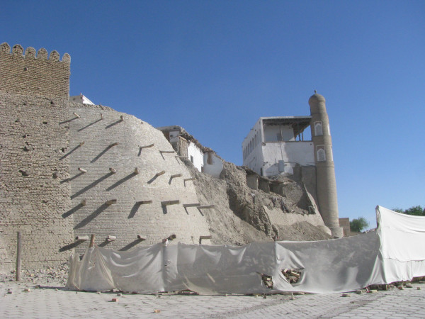 Historia lubi się też powtarzać, zapewne z przyczyn podobnych jak w czasach Timura (poza pracą niewolniczą) parę lat temu odcinek remontowanych murów Registanu rozleciał się ponownie i straszy obecnie osuniętym rumowiskiem (fot. 7).