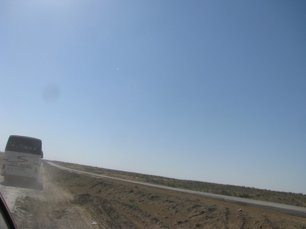 Nikołaj przyjechał po nas do hotelu ok. 6 rano; przy pakowaniu wyraziłem naiwny pogląd, że pewnie z 8 godzin nam zejdzie. Spojrzał jakoś dziwnie i dał słowo byłego pioniera, że na pewno pójdzie szybciej niż w wieku XIV, kiedy zabierało to ok. 15 dni wielbłądziego marszu i że spróbujemy zmieścić się w 20 godzinach. Obietnicy dotrzymał, a jazda „hihgway’em”, z całymi dziesiątkami kilometrów zrytej, dziurawej, gruntowej nawierzchni, w gęstym pyle i przy ok. 40-stopniowym upale, zostawiła niezapomniane wrażenia. Wyprzedzenie byle rozklekotanego autobusu okazywało się sporym wyczynem rajdowym, a podziw dla sprawności i odporności naszej wynajętej limuzyny (prawie „nówki” czyli 13-letniego Daewoo Nexia, ale codziennie starannie wypucowanej przez Nikołaja) rósł z każdą godziną.