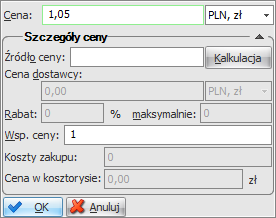 Klikając na polu "Cena jedn.", wprowadzamy po kolei wszystkie ceny RMS. Można to zrobić w sposób globalny, posługując się np. cennikami, ale o tym w późniejszych "Pierwszych krokach..."
