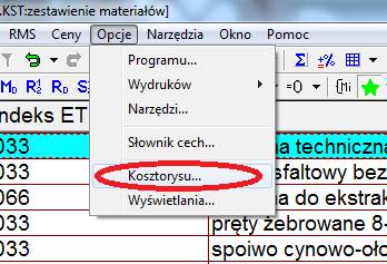 Zabierając się do podziału materiałów wg producentów/dostawców należy upewnić się czy opcje programu Norma są prawidłowo zdefiniowane. W tym celu w menu Opcje wybieramy Kosztorysu...