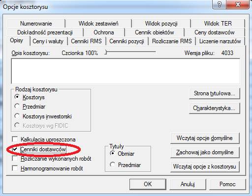 W otwartym oknie Opcje kosztorysu na pierwszej zakładce Opisy zaznaczamy pole Cenniki dostawców.