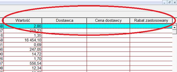Po zaznaczeniu i zatwierdzeniu przyciskiem OK, należy przełączyć się na widok Zestawienia materiałów. Powinny pojawić się na nim dodatkowe kolumny m.in.: Dostawca, Cena dostawcy i Rabat zastosowany.