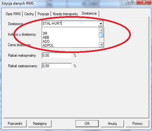 W oknie Zmiana danych zaznaczonych RMS-ów w polu Kod dostawcy wybieramy z listy lub wpisujemy nazwę naszego dostawcy.