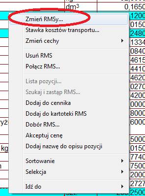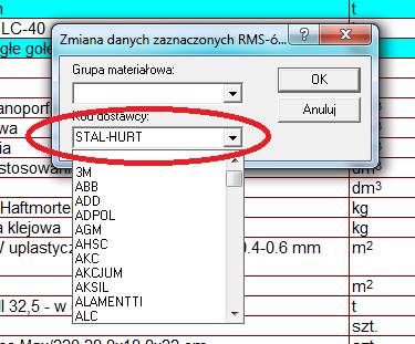 Jeśli jednego dostawcę chcemy przypisać do kilku materiałów jednocześnie, to musimy zaznaczyć te materiały w zestawieniu (za pomocą przycisków Alt lub Shift), a następnie kliknąć prawym przyciskiem myszy na jednym z zaznaczonych, i z menu podręcznego wybrać polecenie Zmień RMSy…