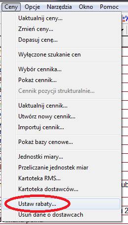 Teraz, skoro już przypisaliśmy dostawcę do materiałów, możemy przypisać do nich również rabaty. Okno definiowania rabatu znajdziemy w menu Ceny w poleceniu Ustaw rabaty.