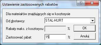 W nowo otwartym okienku Ustawienie zastosowanych rabatów wybieramy nazwę żądanego dostawcy i w polu Zastosować rabat: podajemy jego wielkość, jaką chcemy uwzględnić w kosztorysie.