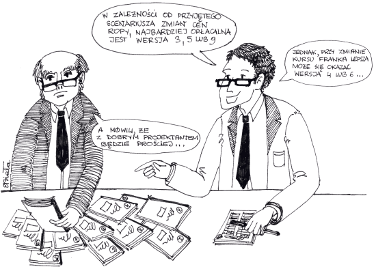 Jeżeli wiemy już jakie składniki wchodzą w skład ww. analizy, należy zadać jeszcze jedno bardzo ważne pytanie: kto taką analizę przeprowadzi i oczywiście kto za nią zapłaci. Naturalną wydaje się odpowiedź, że analizę przeprowadzi projektant, a zapłaci za nią inwestor. Tylko, gdzie znajdziemy inwestora, który będzie chciał wydać dodatkowe pieniądze na jakieś analizy. Owszem, gdy buduje dla siebie i wiąże się z budowlą na kilkadziesiąt kolejnych lat, gotów jest zapłacić za wariantowe projekty. Jeżeli zaś chce sprzedać obiekt "od ręki", to sami wiemy, jak to wygląda. Trochę nowoczesności, trochę tradycji, byle było ładnie, medialnie i dobrze się sprzedało.