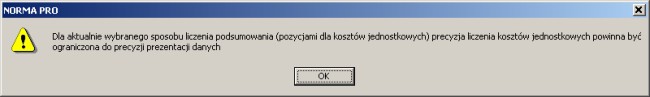 Możemy przy szablonie „Zamówienia publiczne (oferta)” ustawić dokładność prezentacji na dwa miejsca po przecinku ale za to w polu „Dokładność obliczeń kosztów jednostkowych” wybrać hasło „Pełna (maksymalna)” zamiast „Ogranicz. do precyzji wartości jednostk.” (jest to widoczne na rys. 3.). W tym momencie pojawi się komunikat: