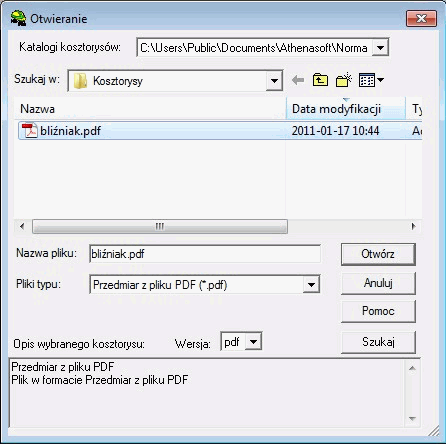 Po wskazaniu pliku myszką (w naszym przykładzie korzystamy z danych wygenerowanych na podstawie kosztorysu przykładowego „Bliźniak”) wystarczy zatwierdzić wybór klawiszem Otwórz i dane przedmiarowe zostaną odczytane.