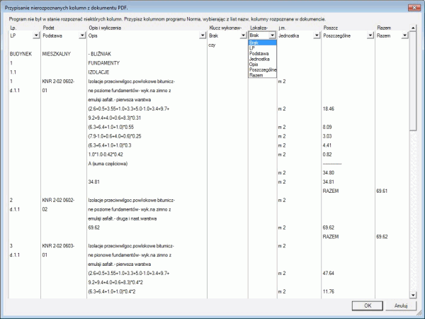 Czasami, w trakcie odczytu, może pojawić się dodatkowe okno Przypisanie nierozpoznanych kolumn z dokumentu PDF, w którym należy sprawdzić czy kolumny są przyporządkowane właściwie do danych z pliku. Wynika to z faktu, że wydruki mogą być modyfikowane np. poszczególne kolumny mogą być różnej szerokości, mieć różne nazwy lub wydruk może być pozbawiony ramek.
