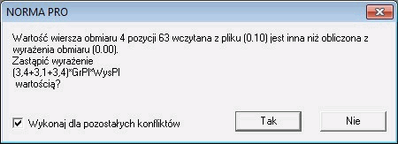 W Normie EXPERT okno niezgodności wygląda nieco inaczej. Opcja Wpisz wczytane działa tak samo jak przycisk TAK w Normie PRO. Zamiast przycisku NIE należy używać guzika "x" w górnym, prawym rogu okna. Przycisk Zapisz do pliku pozwala zapisać na dysku listę wszystkich konfliktów napotkanych w trakcie importu.