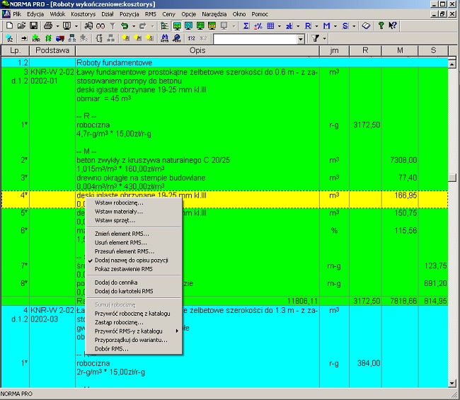 W poprzedniej części „Pierwszych kroków” wspomniałem, jak ważną kwestią przy kosztorysowaniu jest zgodność opisu pozycji kosztorysowej z jej zawartością. Dla przypomnienia – w opisie pozycji mamy „beton C 20/25”, to i w nakładach występuje taki sam beton. Poza metodą wskazaną uprzednio – czyli w pierwszej kolejności zmiana opisu pozycji, a w drugiej zmiana składnika w nakładach - mamy w programie udogodnienie, które pozwoli nam tę operację przyspieszyć. Mianowicie odwracamy kolejność postępowania. Najpierw modyfikujemy poprawnie informację o materiale, „we wnętrzu normatywu” lub na zestawieniu materiałów, a w drugiej kolejności… tu korzystamy z udogodnienia, które zaoszczędzi nam czas przy wpisywaniu nazwy materiału w opisie samej pozycji. Wykorzystujemy w tym celu funkcję „Dodaj nazwę do opisu pozycji” – prawy klawisz myszy na określonym materiale. Spowoduje to umieszczenie opisu materiału w opisie pozycji. Operację tę możemy wykonać będąc w trybie edycji kosztorysu – ikonka [Pełny kosztorys] (klawisz F5) - wówczas dokonamy dodania opisu w pojedynczej pozycji, a możemy również to zrealizować na ikonce [Zestawienie materiałów] (klawisz Ctrl+F6), z tą różnicą że w tym miejscu dodamy opis materiału globalnie do wszystkich pozycji kosztorysowych, w których on wystąpił. Ten sposób uszczegółowienia opisu z pewnością przyspieszy nam pracę nad kosztorysem – pamiętajmy zawsze o sprawdzeniu zgodności materiałów z dokumentacją techniczną, zwłaszcza przy wprowadzaniu zmian globalnych. Oczywiście operację dodania nazwy do opisu pozycji możemy w każdym momencie cofnąć, odznaczając wcześniej wybraną funkcję (ponowne wybranie „Dodaj nazwę do opisu pozycji”) – lokalnie lub globalnie.
