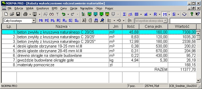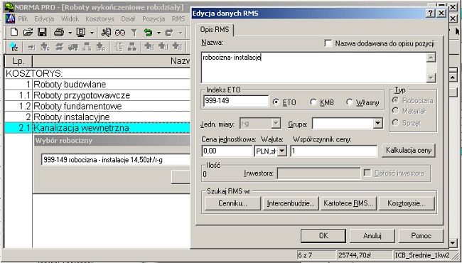 Właśnie globalnie wprowadzane zmiany, czy to opis materiału bądź sprzętu, czy zmiana ceny, wymagają szczególnej uwagi kosztorysanta. Nieraz zdarzyło się, że taka „szybka” zmiana nieźle namieszała w całym kosztorysie. Jak ustrzec się błędu? Przede wszystkim musimy skontrolować poprawność użycia określonych materiałów, po drugie ich ceny. W tym celu wybieramy ikonkę [Zestawienie materiałów], następnie naciskamy ikonkę [Pozycje zawierające RMS] (lub prawy klawisz myszy – „Lista pozycji”). Pojawi się nam wówczas dodatkowe okienko, w którym możemy prześledzić miejsce występowania określonego składnika materiałowego. W tym miejscu mamy również informację o zużyciu normowym materiału, jego ilości oraz wartości. Dostępny jest także opis pozycji. Klawisz „Idź do pozycji” automatycznie przeniesie nas do konkretnej pozycji, w której będziemy mogli bezpośrednio dokonać zmian w opisie robót, składnikach RMS, nakładach, cenach. Może się bowiem zdarzyć sytuacja, że w wybranych pozycjach zdecydujemy się na inne ceny materiałów bądź sprzętu, aniżeli w pozostałych. Najczęstsze powody takich zmian to materiał będący na składzie w magazynie, lub z odzysku, gdzie cena może być niższa aniżeli analogicznego materiału ze „świeżej” dostawy. Aby takiej zmiany dokonać, należy po wciśnięciu ikonki [Pełny kosztorys] (F5) dwukrotnie kliknąć na opisie materiału. Pojawi się wówczas dodatkowe okienko, w którym będziemy mogli dokonać modyfikacji ceny (również opisu). Pokaże się również komunikat – „W kosztorysie są już RMS-y z indeksem ETO identycznym, jak wstawiany”, stąd jeżeli dokonamy zmiany ceny oraz naciśniemy klawisz „Wstaw” na zestawieniu materiałów, będziemy mieli dwa identyczne materiały z różnymi cenami, z tym, że ten drugi będzie oznaczony znaczkiem [’] (prim). Jeżeli wykonamy taką samą operację w innych pozycjach, kolejny materiał otrzyma dodatkowy wyróżnik w postaci kolejnego prim [’’] (podwójne prim, czyli bis) itd.