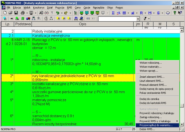 A co w przypadku, gdy nie chcemy jakiegoś składnika M, S w pozycji kosztorysowej? Podobnie, jak w ostatnio opisanej funkcji stosowanej dla działów – „Przyporządkuj do wariantu” - element zawsze nieaktywny - tym razem wybieramy tę funkcję po podświetleniu „niechcianego” składnika przy wciśniętej wcześniej ikonce [Pełny kosztorys] (F5). I podobnie, jak dla działów, tak i tu możemy z powrotem „odzyskać” składnik wybierając -> element zawsze aktywny – bez uciekania się do kasowania składnika, a później wkopiowywania. Jak widzimy, z tych samych funkcji możemy skorzystać na wiele sposobów.