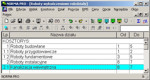 Opisywany ostatnio podział na Działy może pełnić też dodatkową rolę, która umożliwi zastosowanie różnych stawek i narzutów w kosztorysie. Często zdarza się, zwłaszcza przy większych robotach, że cześć prac wykonują firmy zaprzyjaźnione /podwykonawcy – najczęściej są to firmy branżowe – instalacyjne, elektryczne. Może się wówczas zdarzyć, że zastosują oni inne stawki i narzuty kosztorysowe aniżeli te, które my stosujemy. Ponieważ mamy dostarczyć inwestorowi jeden kosztorys, a chcemy zachować stawki i narzuty nasze oraz branżowe, dokonujemy w kosztorysie dodatkowego podziału na Działy. Tym razem są to działy branżowe. Aby to wprowadzić, naciskamy na ikonkę [+DZ] – wpisujemy opis działu np. „Roboty budowlane” oraz wybieramy „Następny poziom”. Identycznie postępujemy dla działów dostarczonych przez branżystów.