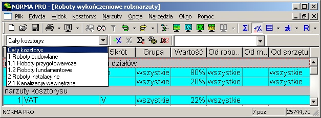 Po tak wykonanej operacji możemy wprowadzić właściwe stawki robocizny oraz narzuty. W tym celu możemy z menu głównego programu wybrać -> Kosztorys -> Narzuty kosztorysu -> rozwinąć listę działów i dla każdego, po kolei wpisać odpowiednie narzuty. Operację tę możemy też wykonać przy wciśniętej ikonce [+DZ], wybierając z menu głównego -> Dział -> Narzuty.