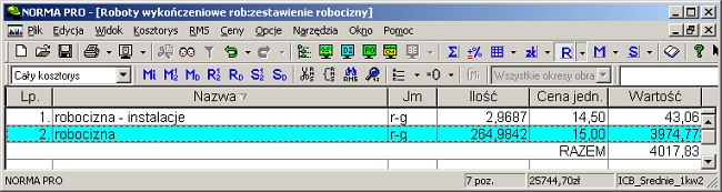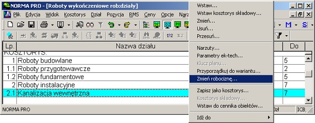 Z kolei stawkę r-g dla działów zmieniamy po naciśnięciu prawego klawisza myszy (przy wciśniętej ikonce [+DZ]), wybierając „Zmień robociznę”. Naciskamy klawisz „Dodaj” – wprowadzamy opis, np. robocizna - instalacje, a następnie cenę jednostkową, i na zakończenie wybieramy klawisz „OK”.