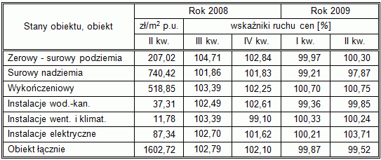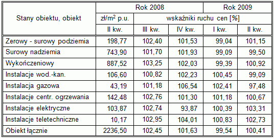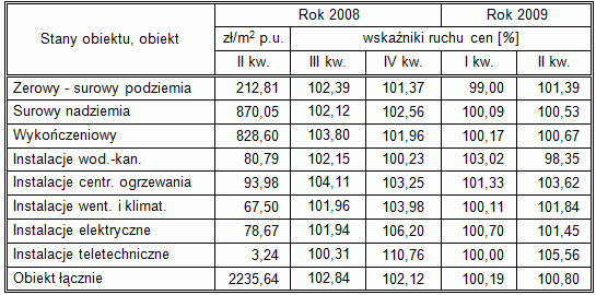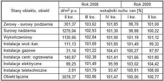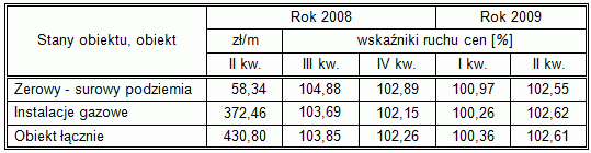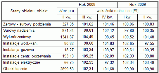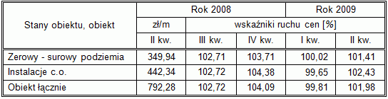 Kolejna informacja o ruchu cen w budownictwie dotyczy okresu od II kwartału 2008 do II kwartału 2009 r. Prezentowane dane, wynikające z analizy i porównań dokonanych na przykładzie wybranych jedenastu obiektów modelowych, przedstawiam w ujęciu procentowym. W pierwszej kolumnie zamieszczam ceny jednostki umownej obiektu i wyróżnionych w nim zakresów robót odnotowane w II kwartale 2008 r., co umożliwi Czytelnikom określenie wzrostu cen w dowolnych przedziałach czasowych ostatnich 12 miesięcy.