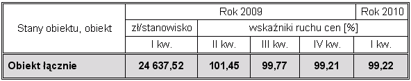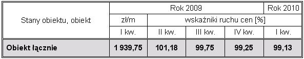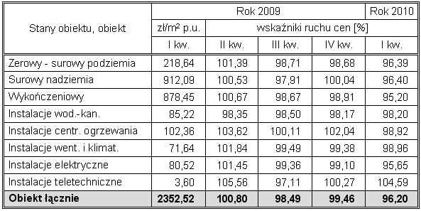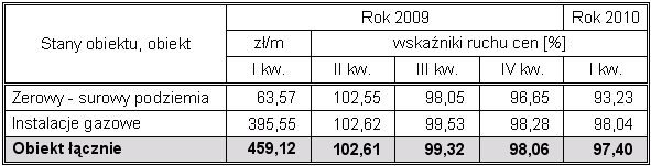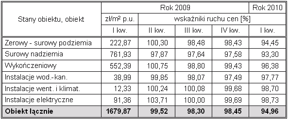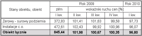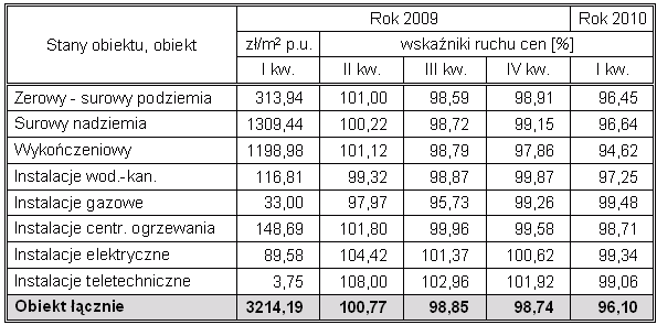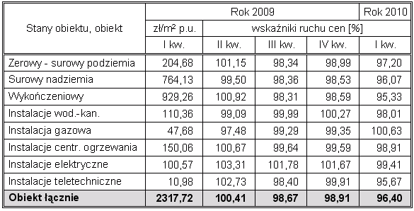 Kolejna informacja o ruchu cen w budownictwie dotyczy okresu od I kwartału 2009 do I kwartału 2010 r. Prezentowane dane, wynikające z analizy i porównań dokonanych na przykładzie wybranych jedenastu obiektów modelowych, przedstawiam w ujęciu procentowym. W pierwszej kolumnie zamieszczam ceny jednostki umownej obiektu i wyróżnionych w nim zakresów robót odnotowane w I kwartale 2009 r., co umożliwi Czytelnikom określenie wzrostu cen w dowolnych przedziałach czasowych ostatnich 12 miesięcy.