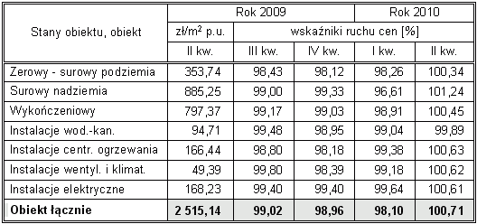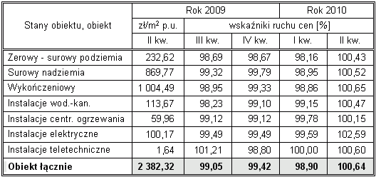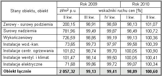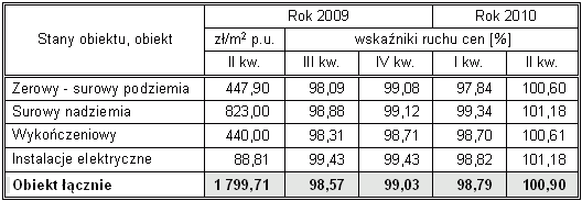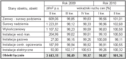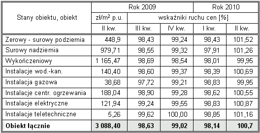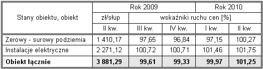 Kolejna informacja o ruchu cen w budownictwie dotyczy okresu od II kwartału 2009 do II kwartału 2010 r. Prezentowane dane, wynikające z analizy i porównań dokonanych na przykładzie wybranych jedenastu obiektów modelowych, przedstawiam w ujęciu procentowym. W pierwszej kolumnie zamieszczam ceny jednostki umownej obiektu i wyróżnionych w nim zakresów robót odnotowane w II kwartale 2009 r., co umożliwi Czytelnikom określenie wzrostu cen w dowolnych przedziałach czasowych ostatnich 12 miesięcy.