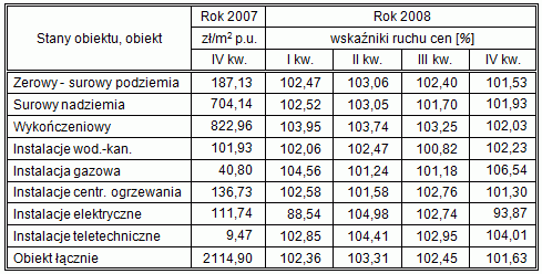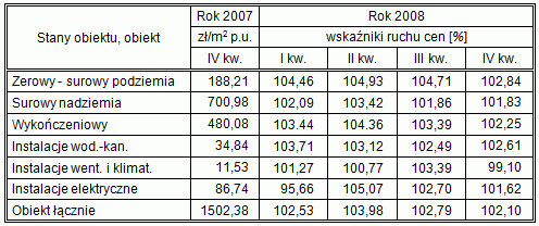 W aktualnym numerze informacja o ruchu cen w budownictwie dotyczy okresu od IV kwartału 2007 do IV kwartału 2008 r. Prezentowane dane, wynikające z analizy i porównań dokonanych na przykładzie wybranych jedenastu obiektów modelowych[1], przedstawiam w ujęciu procentowym. W pierwszej kolumnie zamieszczam ceny jednostki umownej obiektu i wyróżnionych w nim zakresów robót odnotowane w IV kwartale 2007 r., co umożliwi Czytelnikom określenie wzrostu cen w dowolnych przedziałach czasowych ostatnich 12 miesięcy.